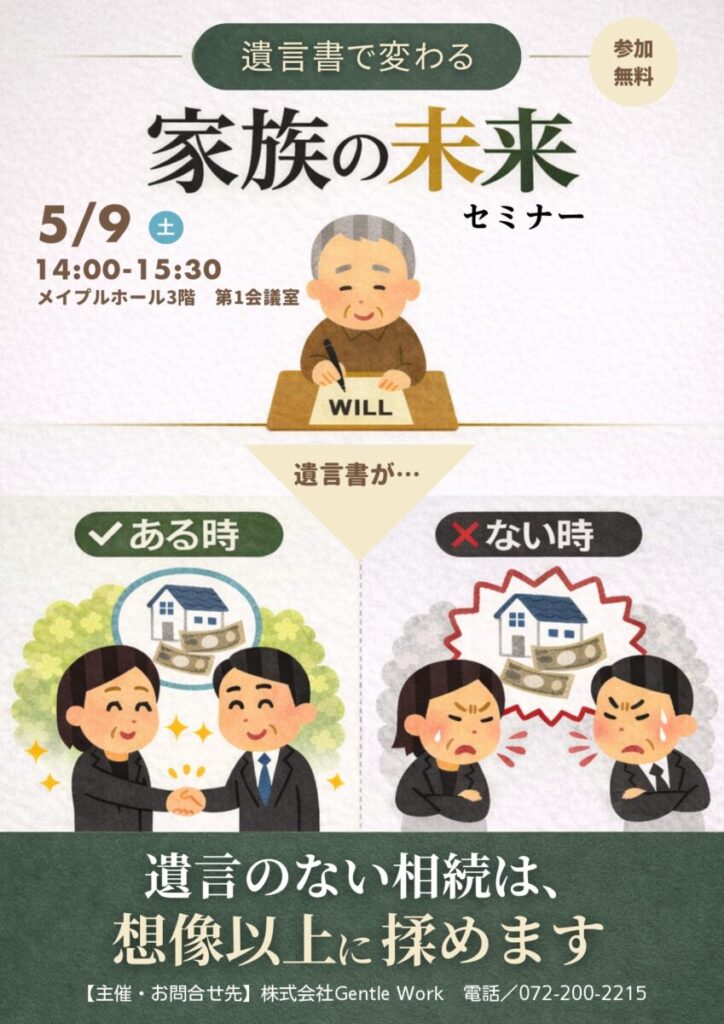 • 5/9(土)遺言書で変わる家族の未来|遺言書セミナー開催のお知らせ【箕面市】