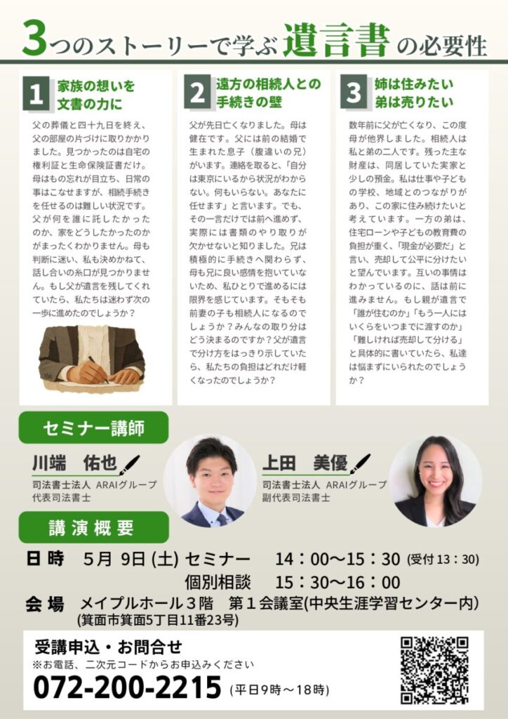 5/9(土)遺言書で変わる家族の未来|遺言書セミナー開催のお知らせ【箕面市】